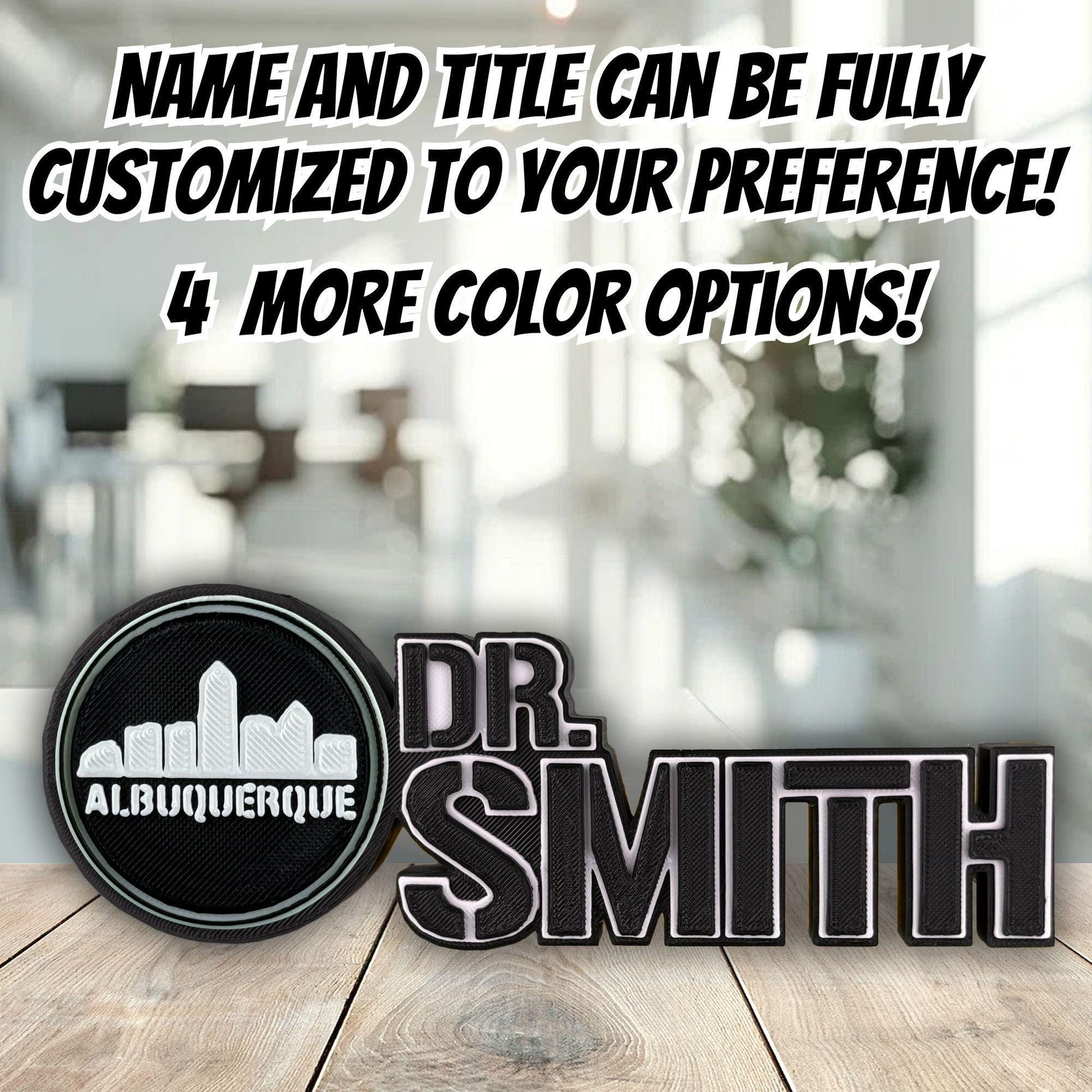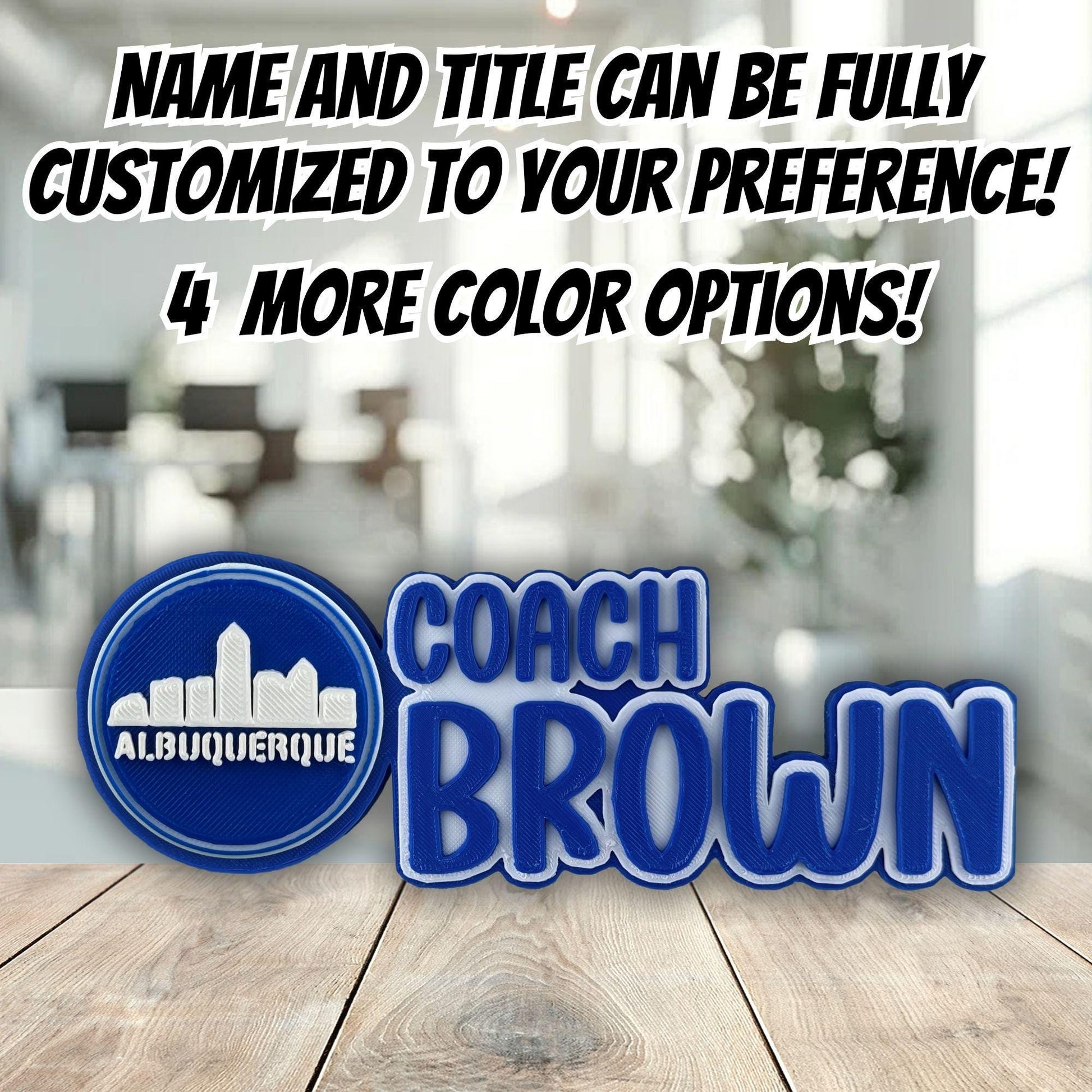 Additionally, if you’d like, I can replace the City Views logo on the left side of the Albuquerque desk name plate with any logo of your choice — perfect for a teacher desk sign, boss name plate, or anyone who loves Albuquerque office Décor."