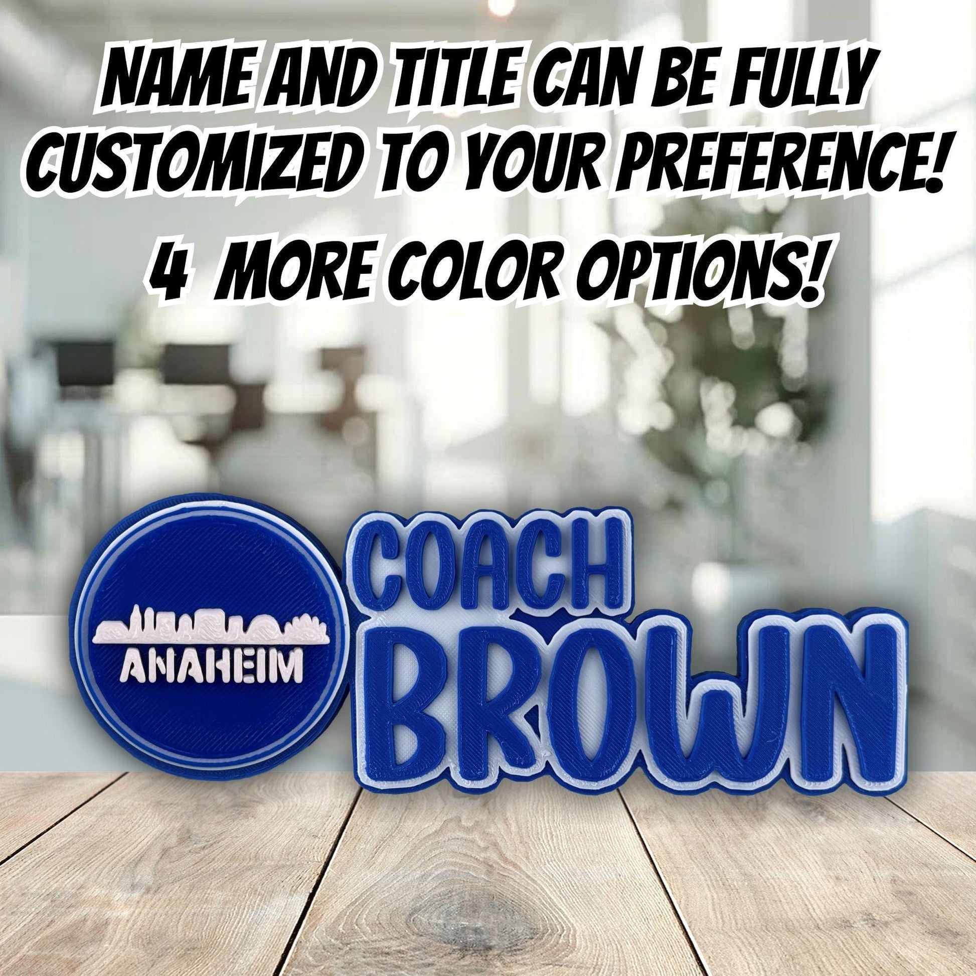 Additionally, if you’d like, I can replace the City Views logo on the left side of the Anaheim desk name plate with any logo of your choice — perfect for a teacher desk sign, boss name plate, or anyone who loves Anaheim office Décor.
