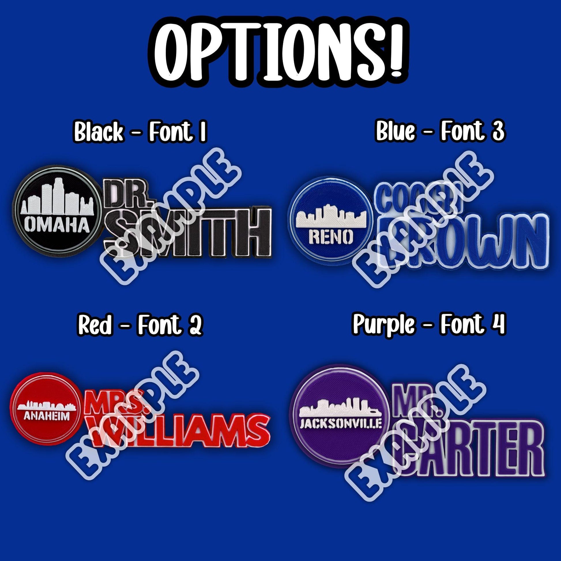 Each color option of your personalized Louisville desk name plate comes with its own unique font style.