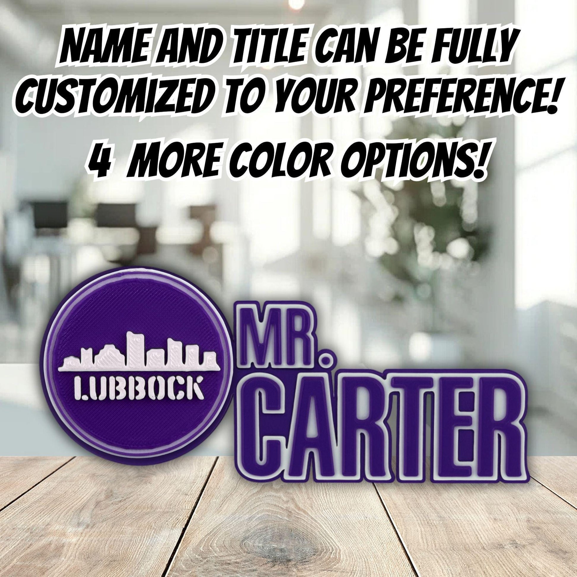 Additionally, if you’d like, I can replace the City Views logo on the left side of the Lubbock desk name plate with any logo of your choice — perfect for a teacher desk sign, boss name plate, or anyone who loves Lubbock office Décor.