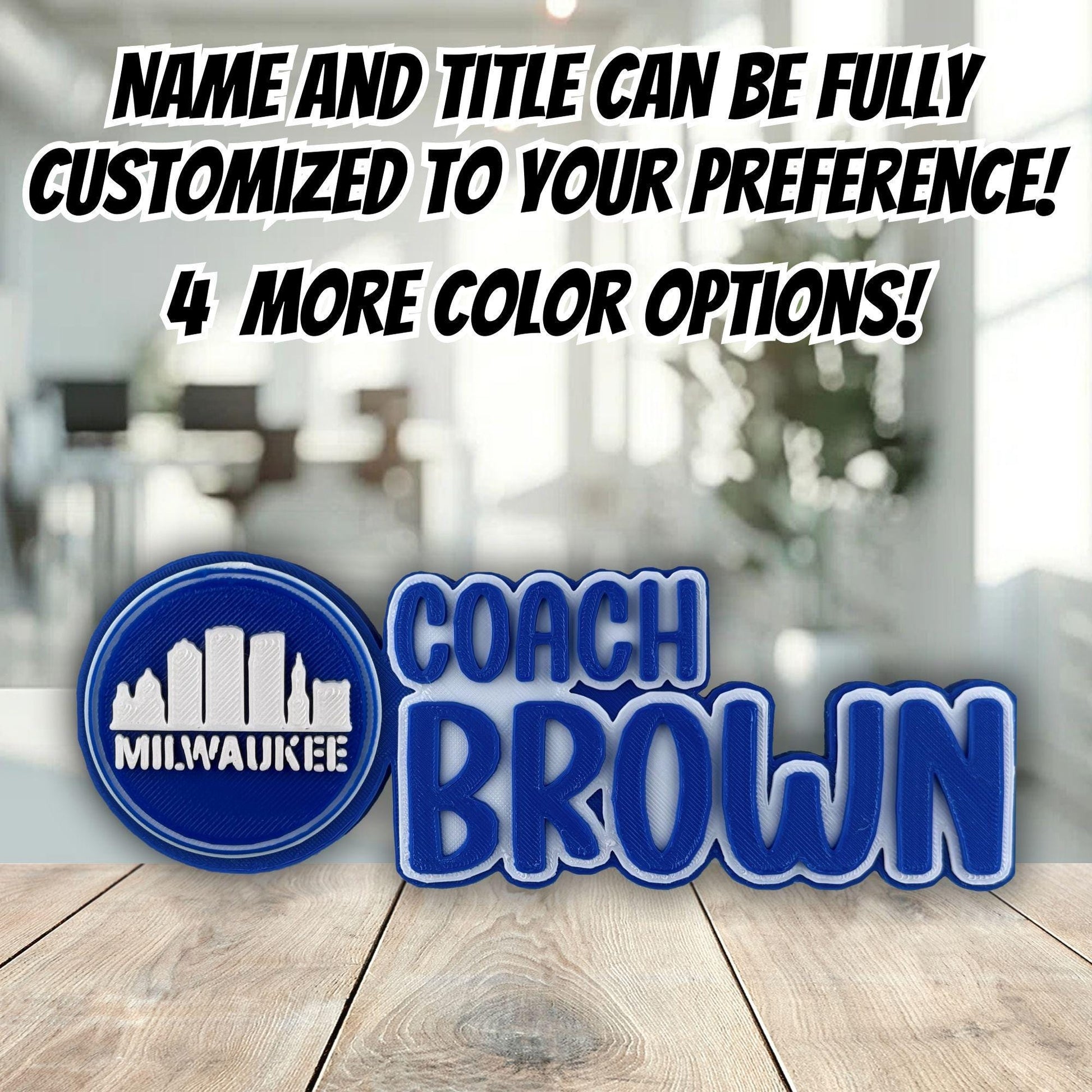 Additionally, if you’d like, I can replace the City Views logo on the left side of the Milwaukee desk name plate with any logo of your choice — perfect for a teacher desk sign, boss name plate, or anyone who loves Milwaukee office Décor."