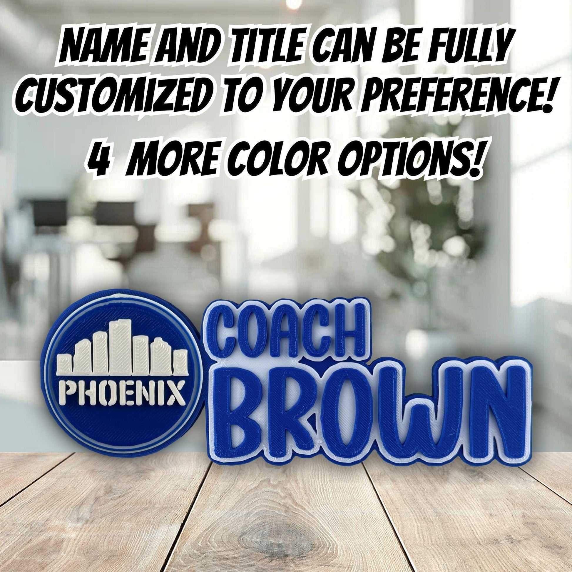 This Phoenix Desk Name Plate with Logo is fully customizable with your name and an optional logo of your choice, making it a unique and meaningful item. Crafted with care and attention to detail, this Personalized Phoenix AZ Skyline Desk Name Plate reflects your style and the character of Phoenix. Perfect for meetings, classrooms, or your home office, this piece of office Décor is both Décorative and practical.