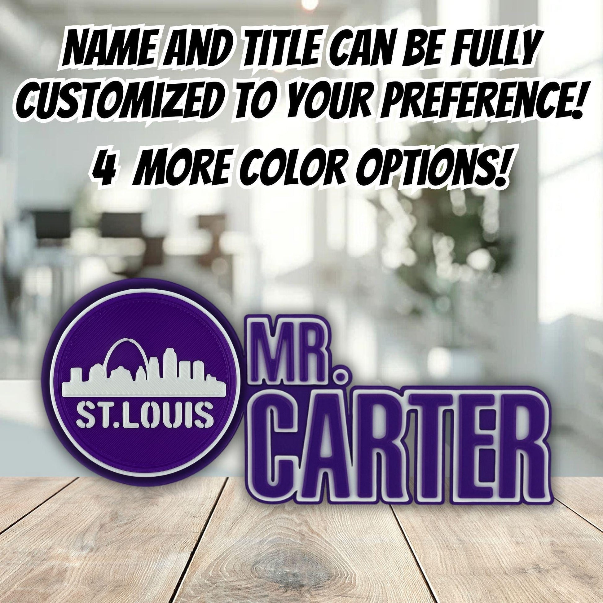 Additionally, if you’d like, I can replace the City Views logo on the left side of the St. Louis desk name plate with any logo of your choice — perfect for a teacher desk sign, boss name plate, or anyone who loves St. Louis office Décor.